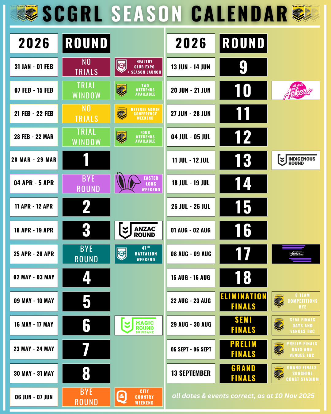 Note – This weekend will be a BYE weekend for SCGRL as per the attached Season Calendar